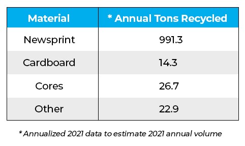 We do not throw away any paper or cardboard. All unused newsprint, test pages, cardboard, cores and other paper based materials are recycled. We use Gordon Recycling to recycle paper based materials.
